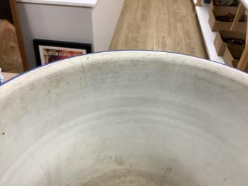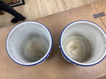 One jardiniere slightly larger than the other; the larger of the two cracked downward from neckrim, almost reaching base; another vertical crack alongside, visible only at interior, image 11; one lion-mask ring missing, the crack and the loss of ring shown in image 6; star-cracks to underside and two cracks to footrim, image 12. Smaller jardiniere one lion-mask ring half-missing, image 7. Both interiors stained.