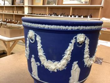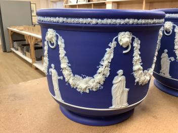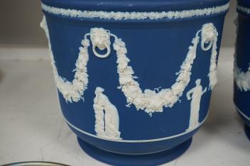 Lot 1124 , A pair of Wedgwood blue Jasperware jardinieres, 23cm high