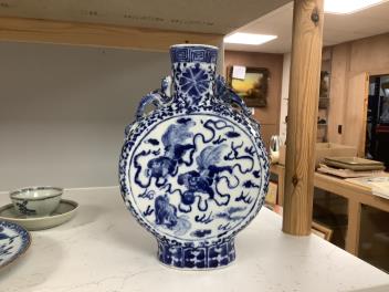 Lot 1146 , Chinese blue and white porcelain consisting of a moonflask, 18th century plate, a Tek Sing cargo tea bowl and saucer and a doucai saucer, largest 25cm high