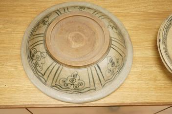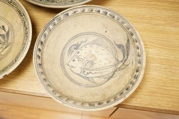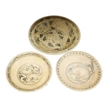 Lot 450 , A group of three Thai underglaze blue or black crackle glaze dishes, two decorated with fish, largest 38cm in diameter