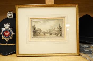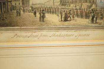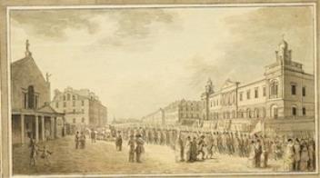 Lot 106 , A.C monogrammist, early 19th century, ‘Prince Street from Shakespear Square’, military interest ink and watercolour, 12 x 18cm