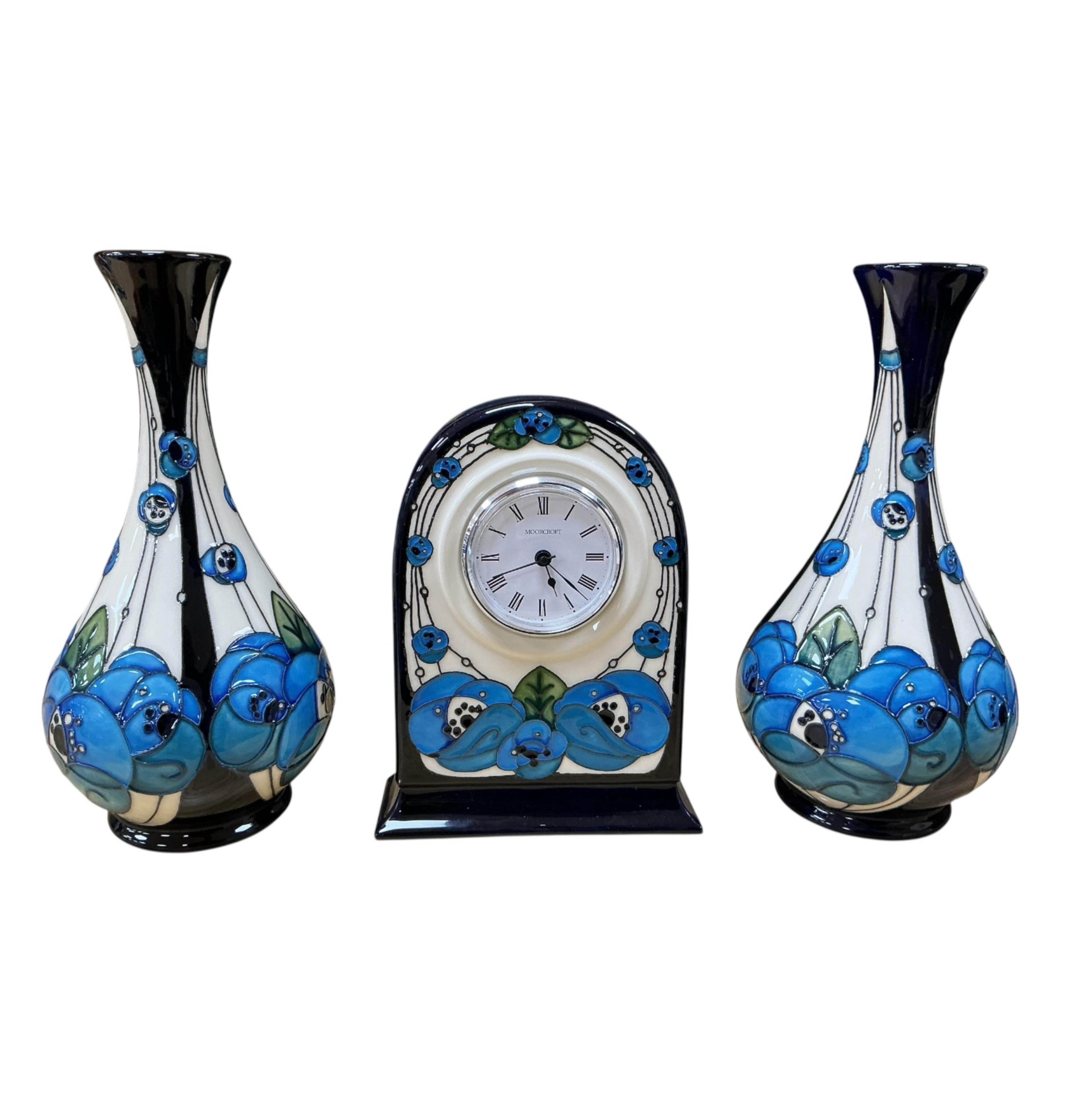 Lot 3125 , Rachel Bishop for Moorcroft: A pair of Rennie Rose pattern modern vases with mantel clock, height(s) 23cm, (3).