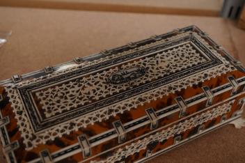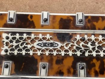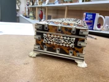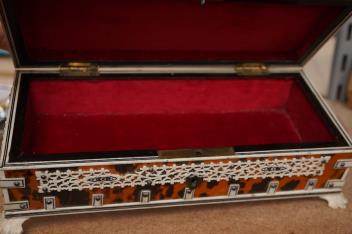 Lot 1386 , A late 19th century tortoiseshell and ivory Vizagapatam box, raised on paw feet with velvet lining to the interior, no key, 22cm wide CITES Submission reference 9FRY73BQ