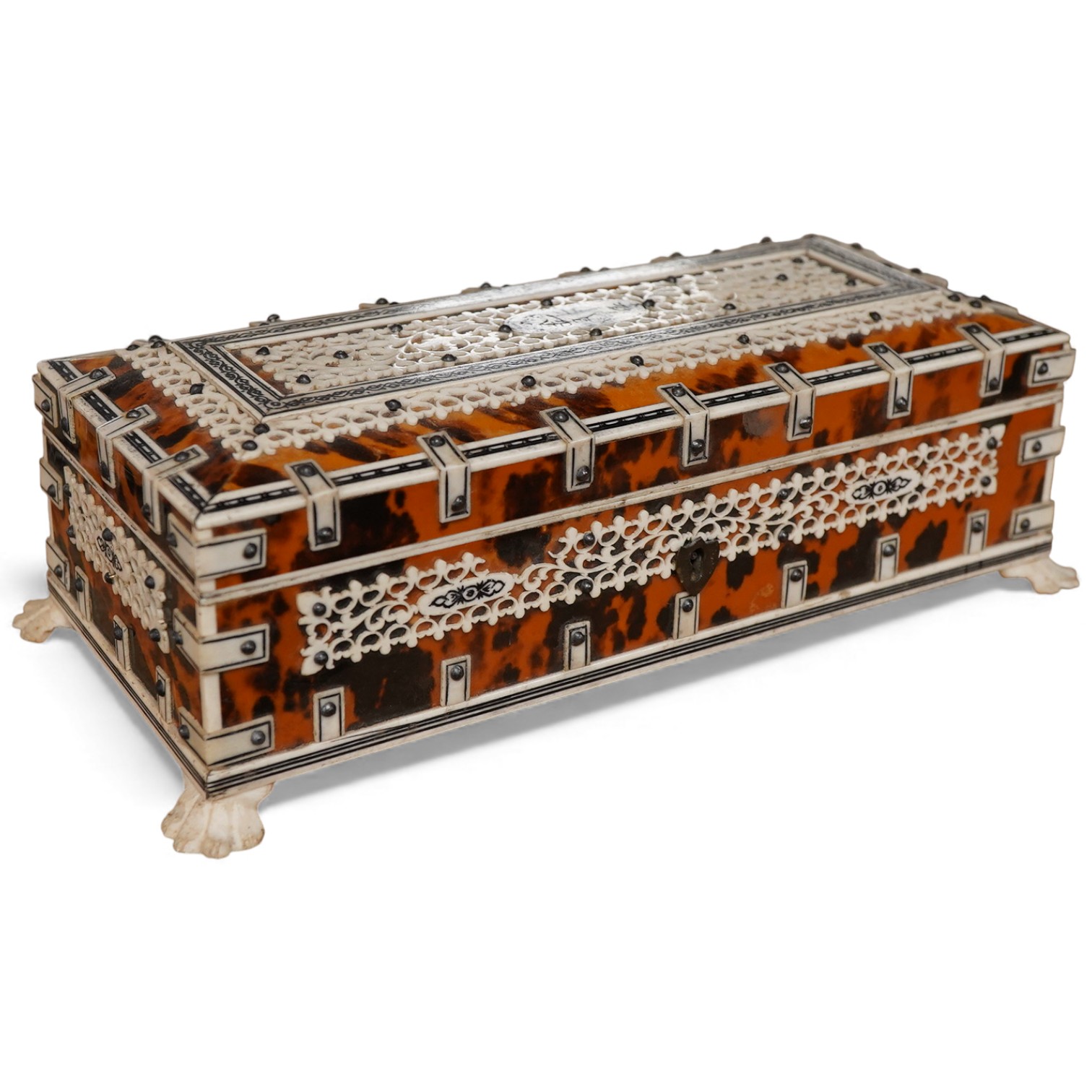 A late 19th century tortoiseshell and ivory Vizagapatam box, raised on paw feet with velvet lining to the interior, no key, 22cm wide CITES Submission reference 9FRY73BQ