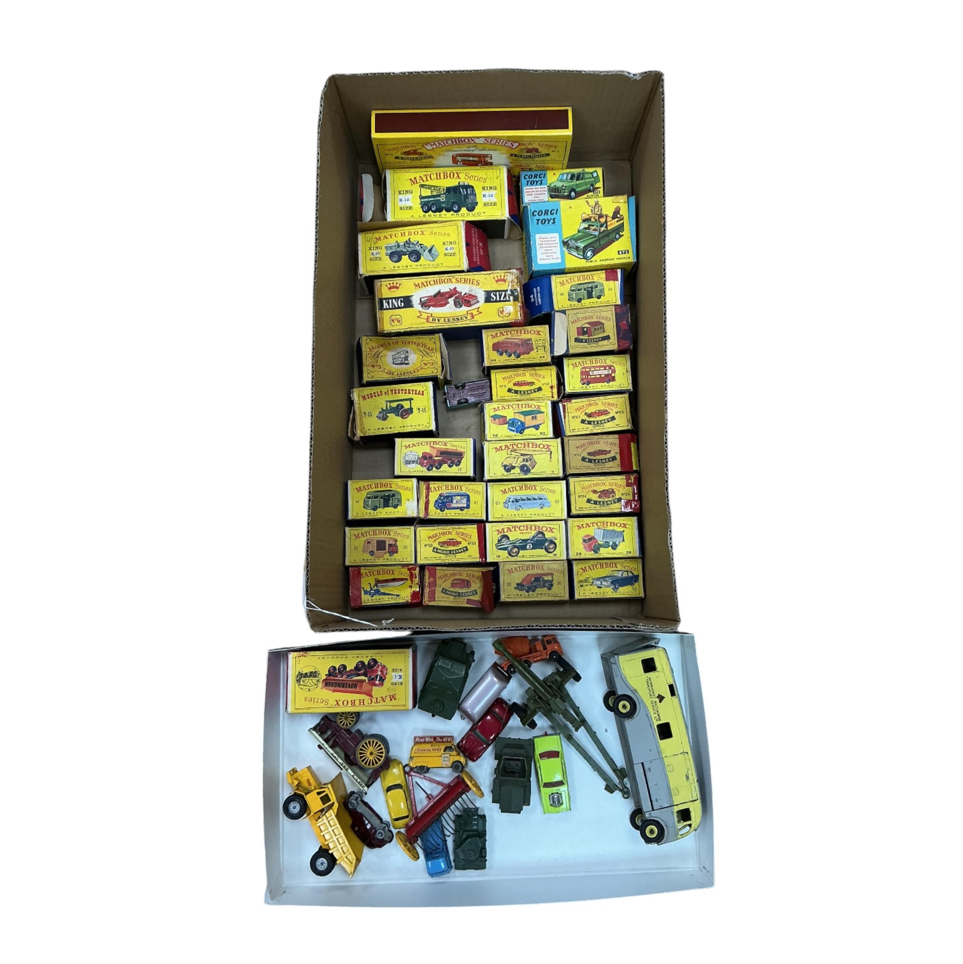A collection of Matchbox and other diecast, including; twenty-two Matchbox Series 1-75 vehicles, all in the remains of their original boxes, together with three King Size, a reproduction 40th Anniversary Set, two boxed Corgi Toys; a Public Address Land Rover (472) and an Austin Mini Van (450), plus a number of unboxed playworn Matchbox, Dinky, Corgi, etc.