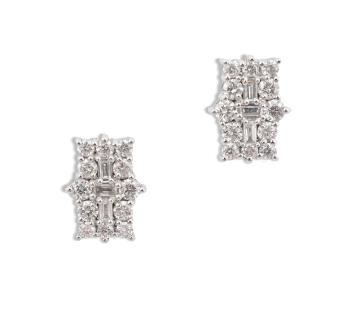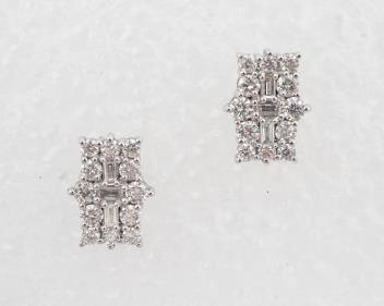 A pair of diamond earrings, designed as clusters of brilliant-cut and baguette diamonds, totalling approximately 1.00 carats, mounted in white gold, 1cm diameter, post fittings, stamped 750, combined gross weight approximately 3 grams