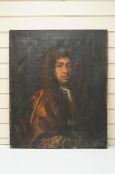 Inscribed to the upper left of canvas, Alan Bellingham of Levens, Westmorland, dyed at St Germanin, France, 1692 There are several areas of overpainting and re-touching throughout. Some paint chips and flaking to the edges and lower centre of the canvas. There is a hole to the canvas on the right of the drapery. The painting is dirty and would benefit from a clean