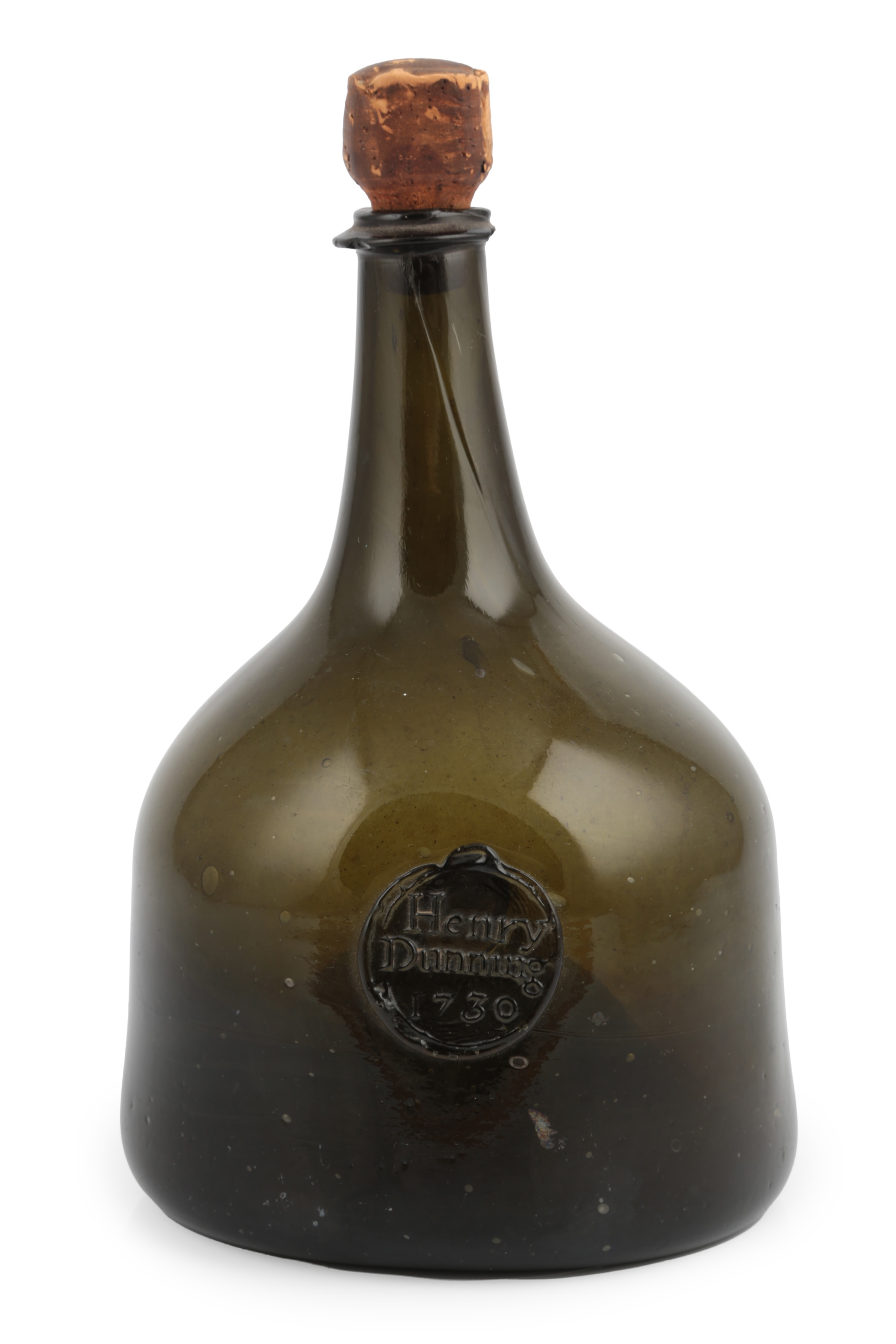 A George II mallet-shaped wine bottle, with moulded seal for Henry Dunning, 1730,