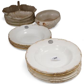 Lot 1337 , A George Jones part dinner service with Shoolbred crest to include soup bowls, side plates and a three section leaf dish