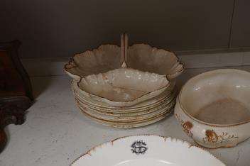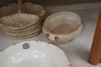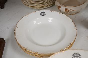 A George Jones part dinner service with Shoolbred crest to include soup bowls, side plates and a three section leaf dish