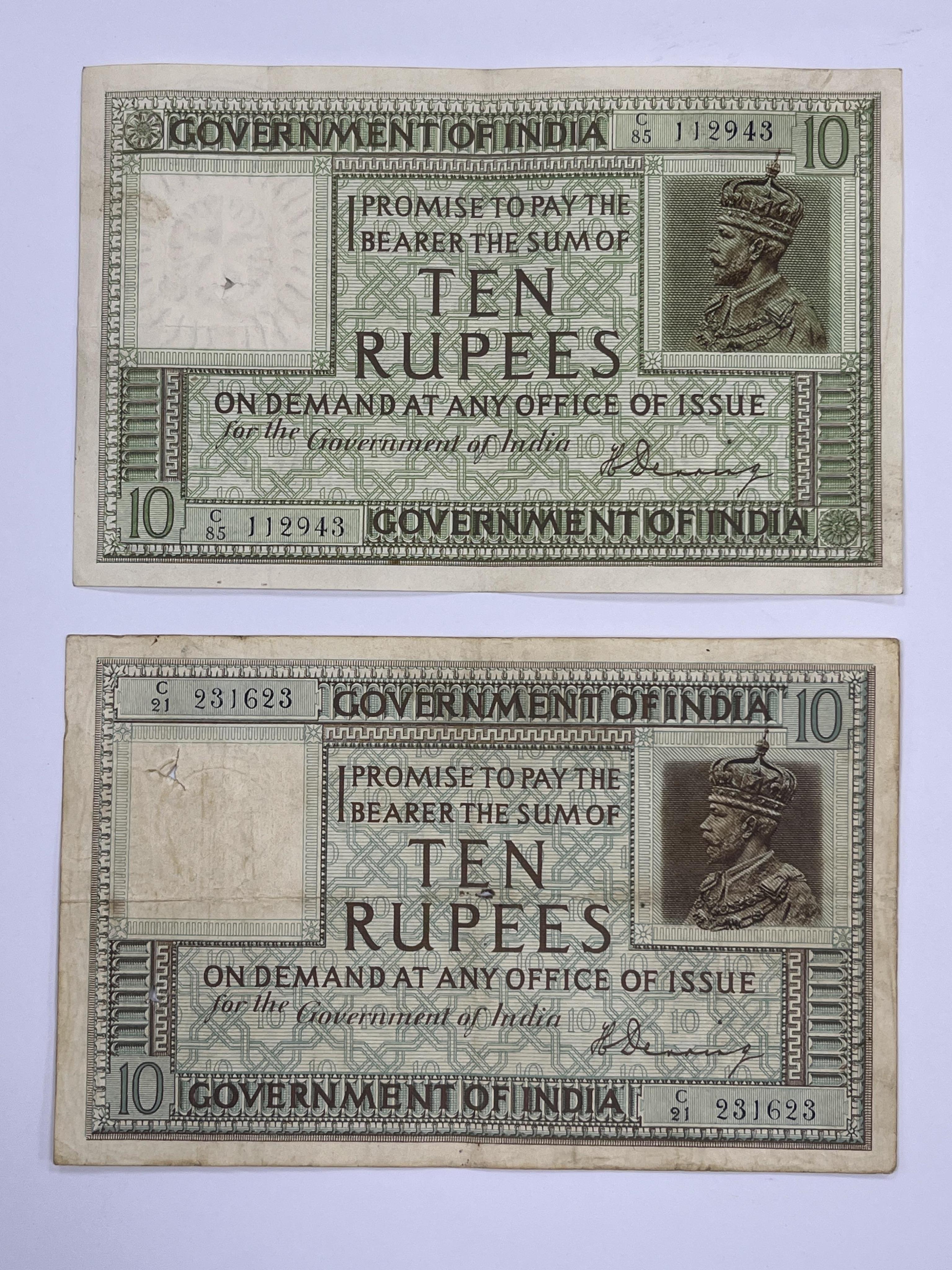 Lot 2064 , Government of India banknotes, 10 Rupees, 1st issue, Type 2 (1925), Denning signature, serial number C/85 112943, spindle holes, folds, slight stains, and, 10 Rupees, 1st issue, Type 1 (1917-23), Denning signature, seria