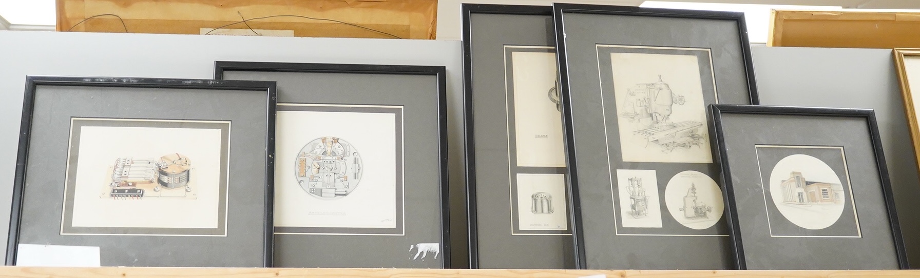 A collection of finely executed watercolour and pencil drawings, some technical subjects to include an accelerometer and Optical Blank Shaping Machine, framed as five, largest overall 40 x 29cm