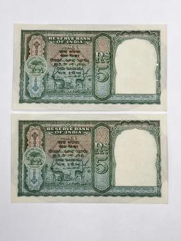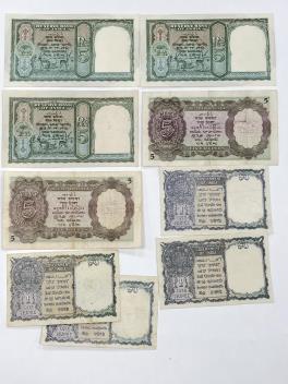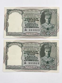 Lot 2071 , Reserve Bank of India banknotes;, three 5 Rupees, (1943), front facing portrait, Deshmukh signature, serial numbers A/92 444823/4 consecutive, pinholes, near UNC and D/5 266370, pinholes, folds, light stains, two 5 Rupee