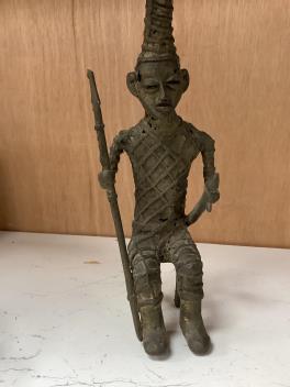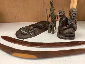 Five ethnographic items; an early 20th century chip carved Australian boomerang-60cm long , together with a later example, a Benin bonds of a warrior seated on a stool, a Makonde African carved figure group and an Africa