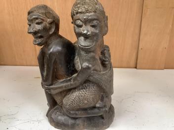 Lot 1348 , Five ethnographic items; an early 20th century chip carved Australian boomerang-60cm long , together with a later example, a Benin bonds of a warrior seated on a stool, a Makonde African carved figure group and an Africa