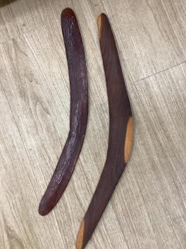 Five ethnographic items; an early 20th century chip carved Australian boomerang-60cm long , together with a later example, a Benin bonds of a warrior seated on a stool, a Makonde African carved figure group and an African carved wood mask,