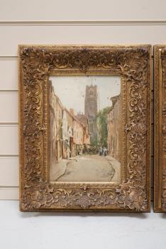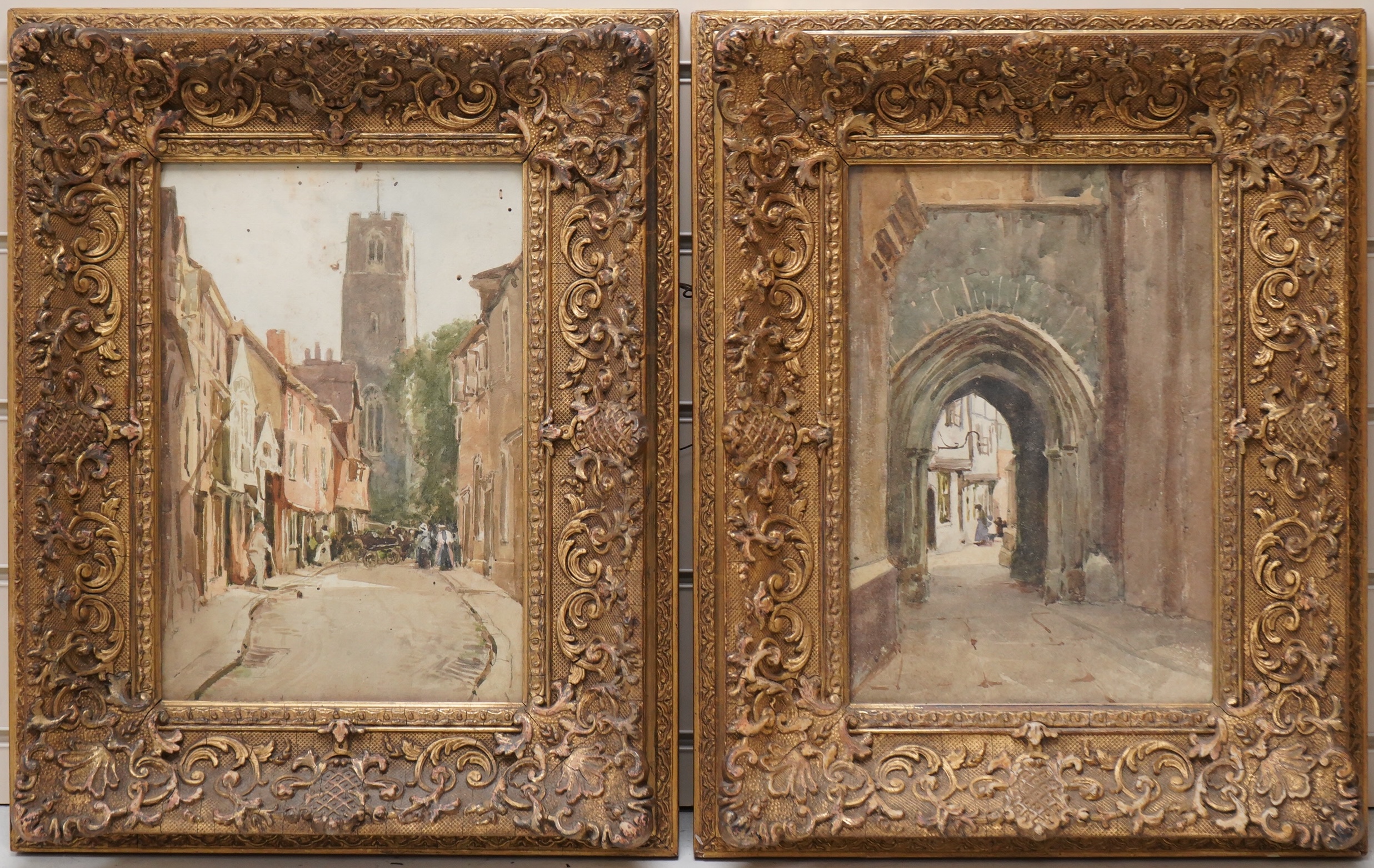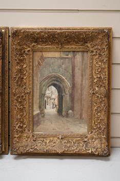 AJW monogrammist, ‘Archway, Norwich’ and ‘A Quaint Street, Norwich’, unsigned, signed in ink verso with ‘By the Late Tatton Winter’ labels, ornate gilt framed, 30 x 22cm