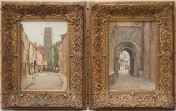 Lot 1711 , AJW monogrammist, ‘Archway, Norwich’ and ‘A Quaint Street, Norwich’, unsigned, signed in ink verso with ‘By the Late Tatton Winter’ labels, ornate gilt framed, 30 x 22cm