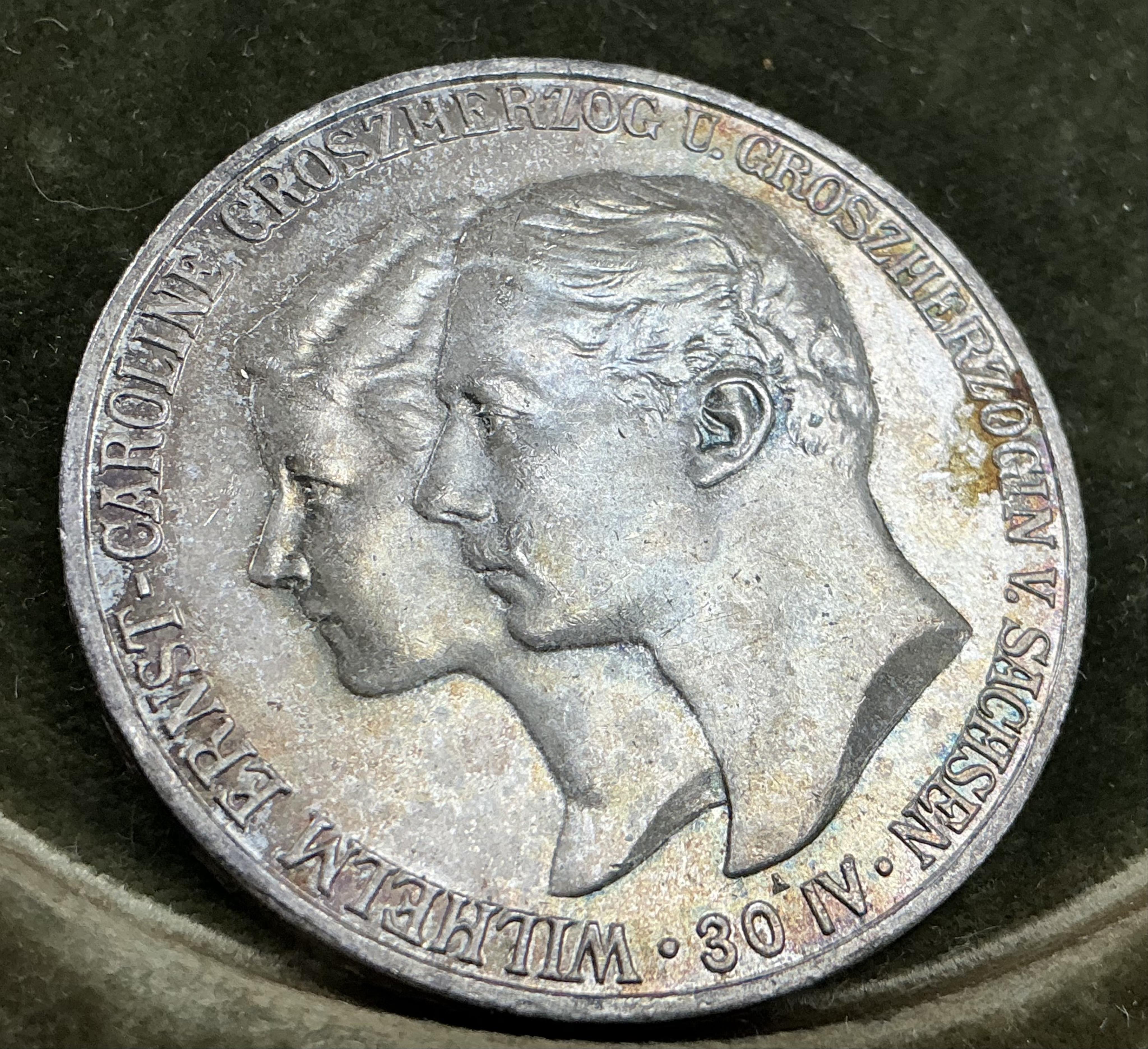 Lot 2037 , German States, Grand Duchy of Saxe-Weimar-Eisenach, Wilhelm Ernst, Grand Duke’s first marriage commemorative silver 5 Marks, 1903 A, KM 218, toned, EF or better