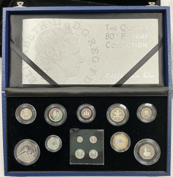 Lot 2088 , British proof silver coins, Elizabeth II, the Queen‘s 80th birthday collection, £5 to 1p together with maundy 1p - 4p, in case of issue with certificate