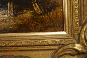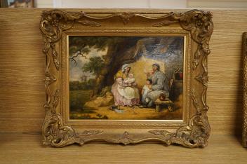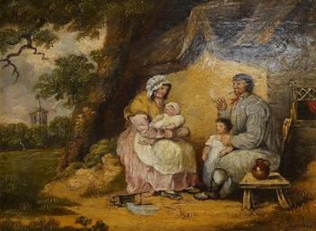 Lot 725 , After George Morland (1763-1804), family gathering before a cottage, bears signature, oil on board, 22 x 29cm
