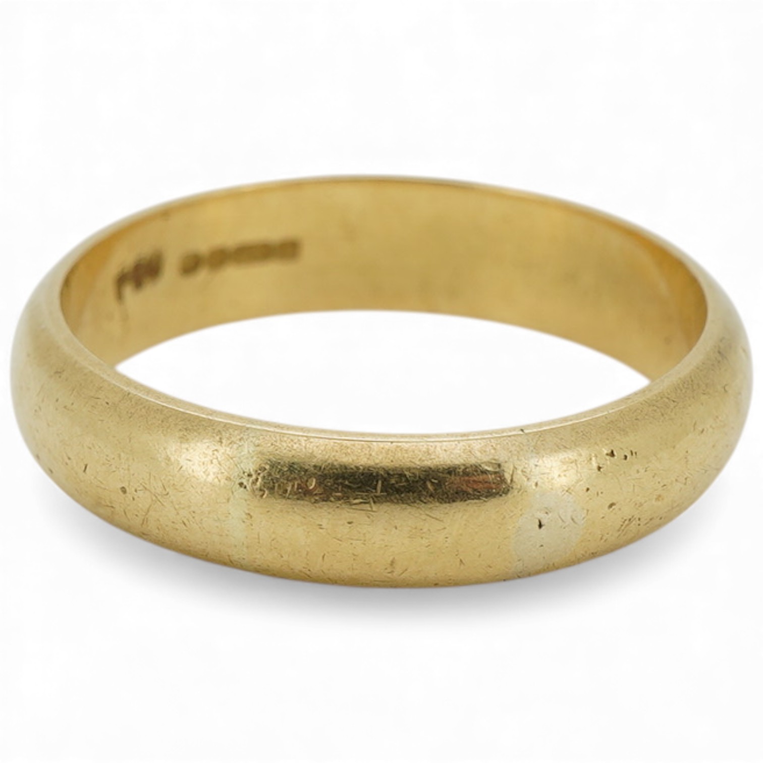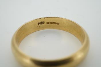 Lot 915 , An 18ct gold wedding band, circa 1996, British hallmarks, size R1/2, width 4.9mm, gross weight approximately 6 grams