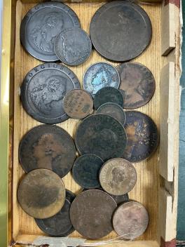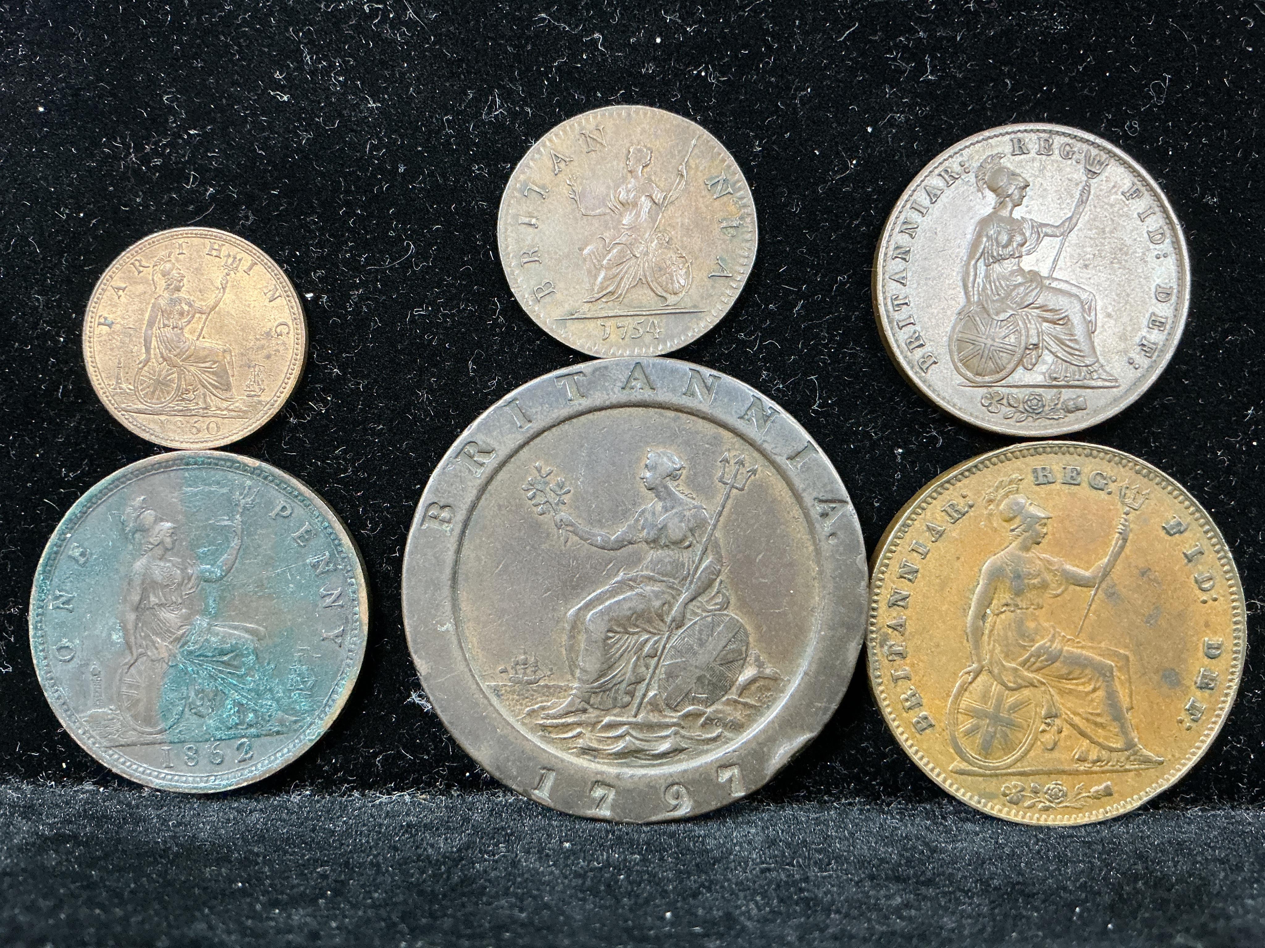 Lot 2015 , British copper and bronze coins, George II to Victoria, twopence to half farthing, highlights include-, George II, farthing, 1754, good VF, George III, twopence, 1797, about VF, Victoria, penny, 1854, good VF, 1862, VF,