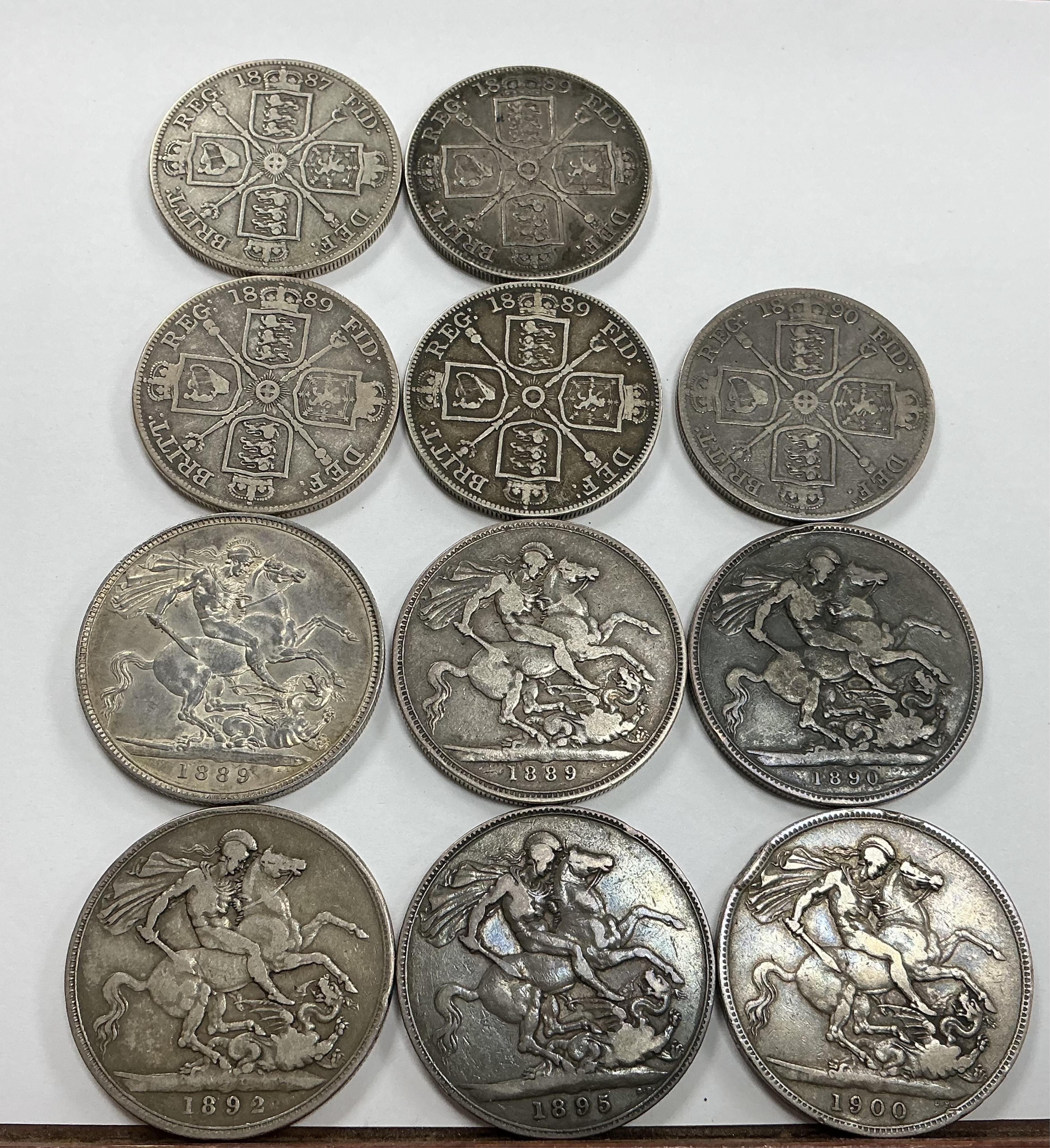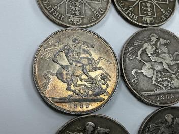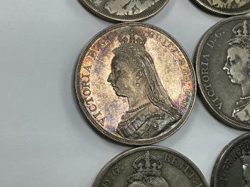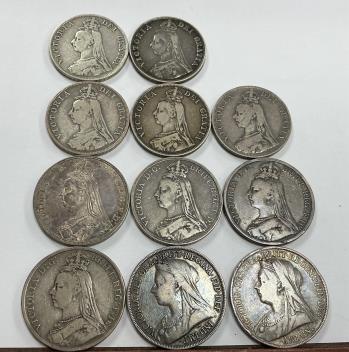 Lot 2008 , British silver coins, Victoria, six crowns; 1889, toned EF, another 1889, 1890, 1892, 1895, 1900, the last five fine, and, five double florins, 1889, VF, 1887, two more 1889, 1890, the last four about fine (11)