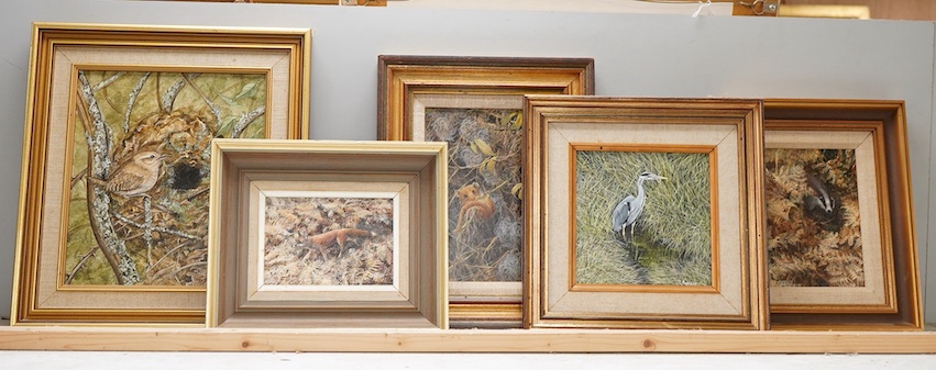 Lot 1709 , Ken Turner (b.1926), Three wildlife studies 'Dormouse', 'Badger' and 'Fox', signed, oil on board, together with two others of a Wren and a Heron, signed Benger, largest 22 x 19cm
