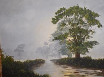 Donald Ayres (British, b.1936), 'River landscape', signed, oil on board, ornate gilt framed, 66 x 85cm