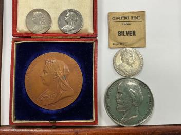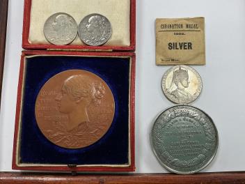 Lot 2028 , Commemorative medals, comprising, Victoria, large Diamond Jubilee bronze medal, in Morocco leather case of issue, two similar small Victoria silver Medals, 1897, uncased, a Edward VII and Alexandra small silver coronatio