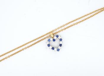 Lot 1923 , A sapphire and diamond heart pendant, set with brilliant-cut diamonds totalling approximately 0.40 carats, and circular-cut sapphires, mounted in 18ct gold, length 1.5cm, British hallmarks, to a gold chain necklace, leng