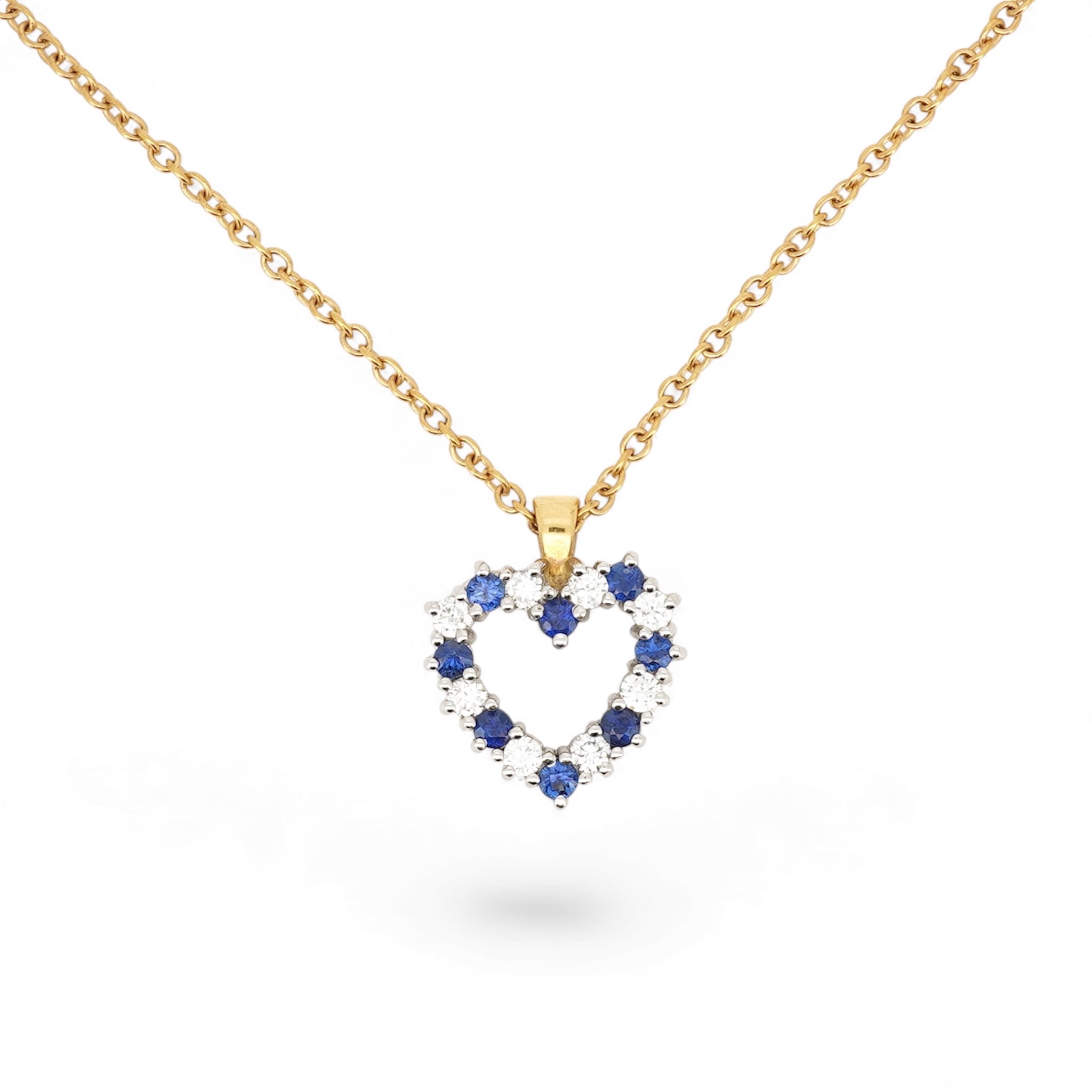 A sapphire and diamond heart pendant, set with brilliant-cut diamonds totalling approximately 0.40 carats, and circular-cut sapphires, mounted in 18ct gold, length 1.5cm, British hallmarks, to a gold chain necklace, length 44cm, stamped 750, total gross weight approximately 5.5 grams