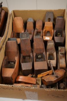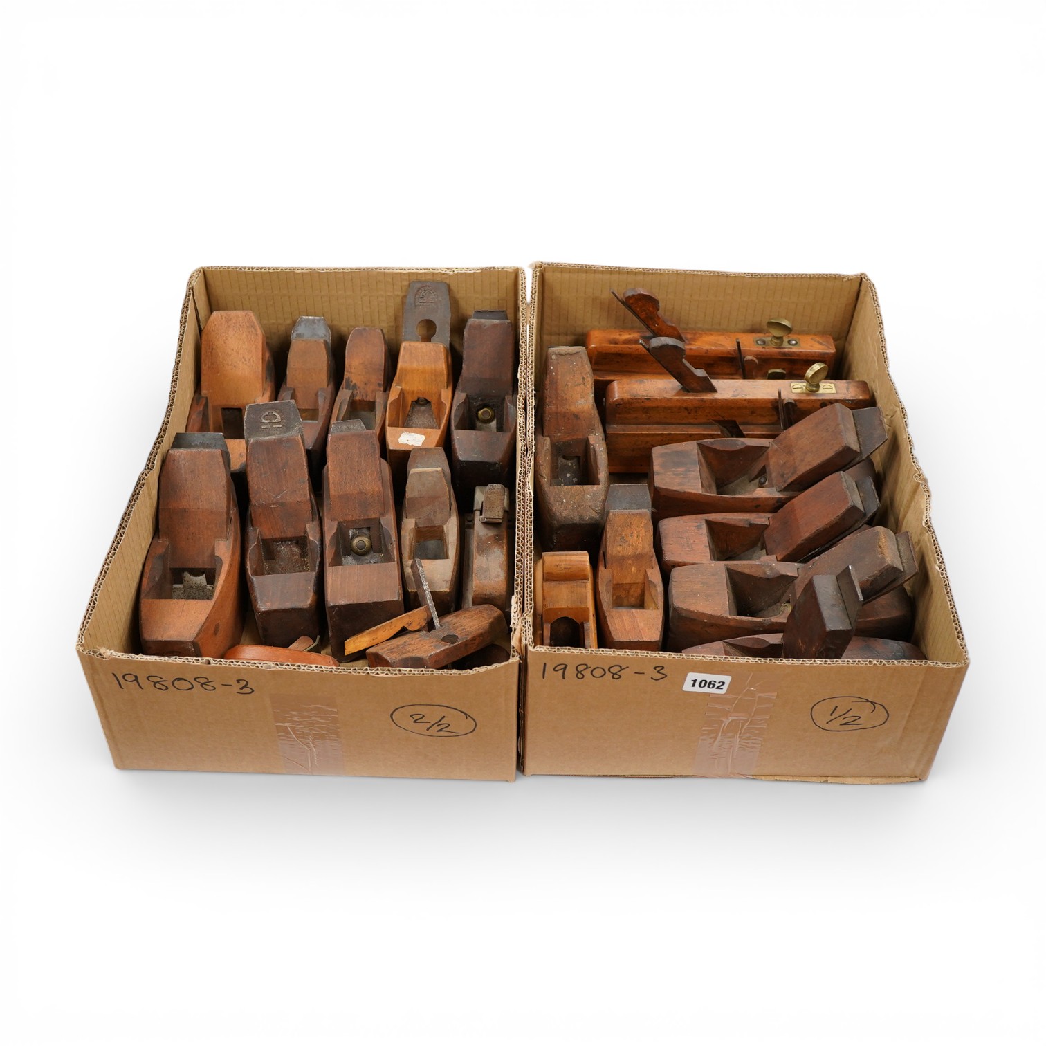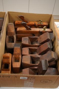 Lot 1062 , A collection of woodworking planes, including; sixteen beechwood smoothing plains, by Marples, etc., some with coffin sides, three thumb planes, two double iron rabbet planes with adjustable depth stops, etc.