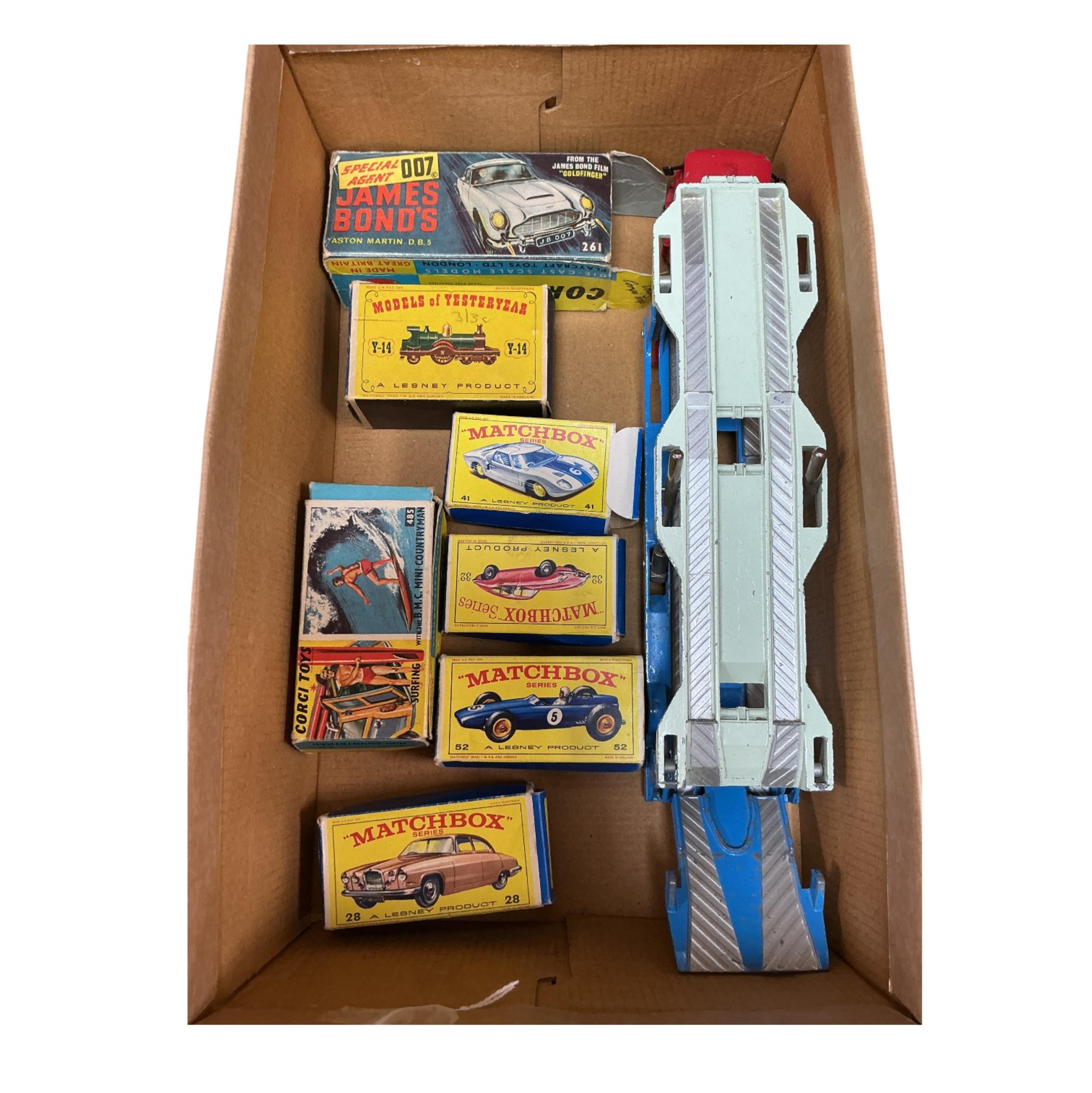 Eight Corgi Toys and Matchbox vehicles; a James Bond 007 Aston Martin DB5 (261) together with the remains of its outer box, a boxed BMC Mini Countryman (485) complete with its driver and two surfboards, an unboxed Carrimore car transporter, four boxed Matchbox Series cars; a Ford GT racer (41), a Jaguar E type (32), a Jaguar Mk.10 (28), and a BRM racing car (52), plus a boxed Models of Yesteryear GWR Duke of Connaught (Y-14)