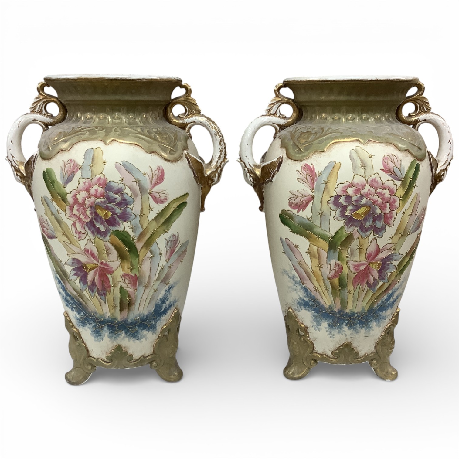 A pair of early 20th century Royal Bonn two handled floral decorated vases, 44cm high