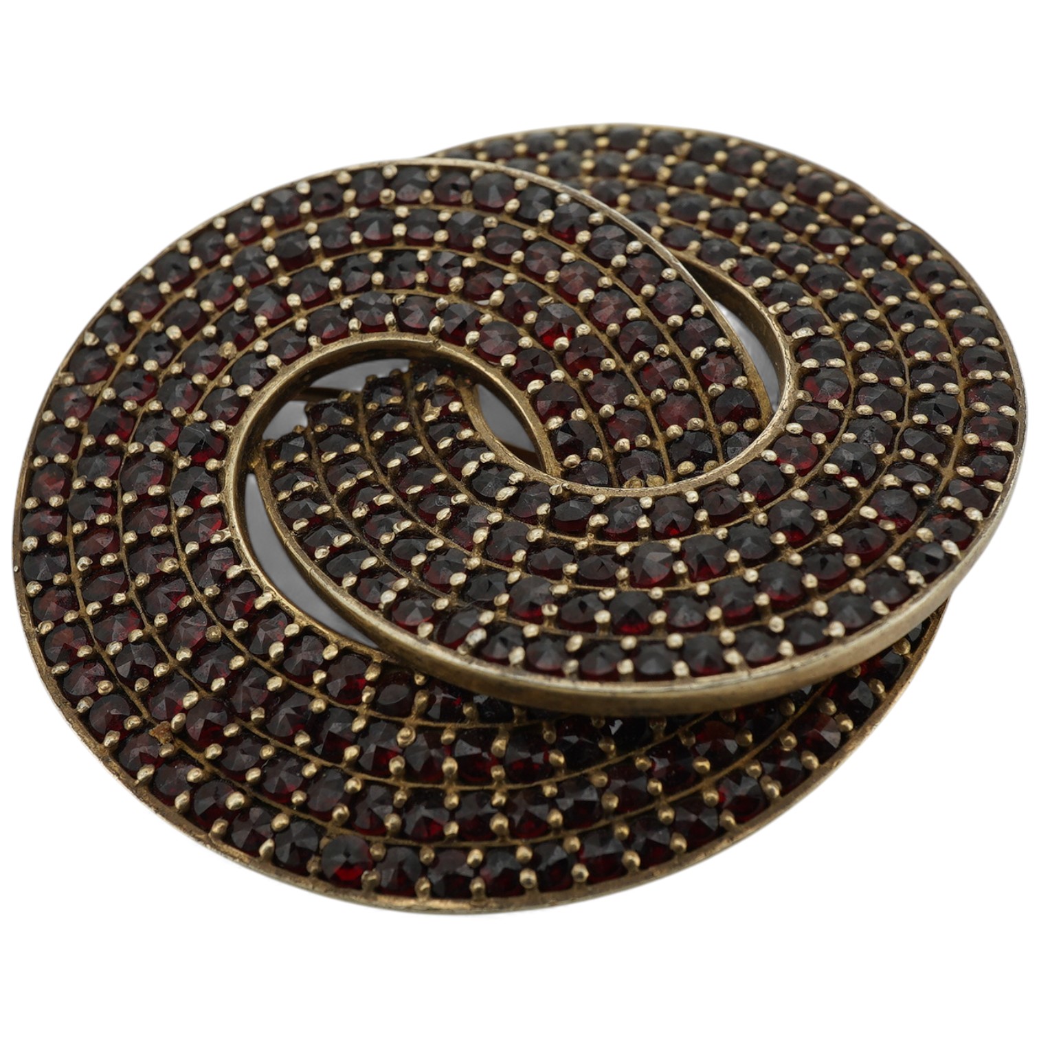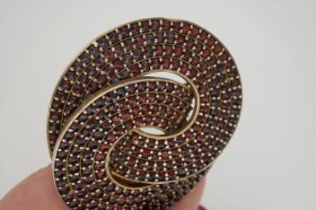 Lot 924 , A garnet brooch, designed as two interlocking hoops, set with rose-cut diamonds, mounted in silver, length 4.8cm
