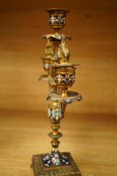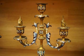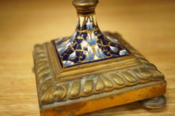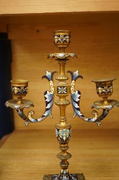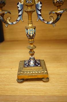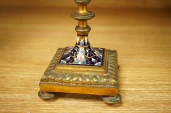 Lot 340 , A pair of late 19th century French brass and champlevé enamel candelabra, 29cm