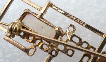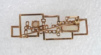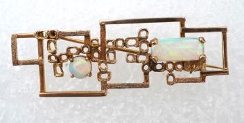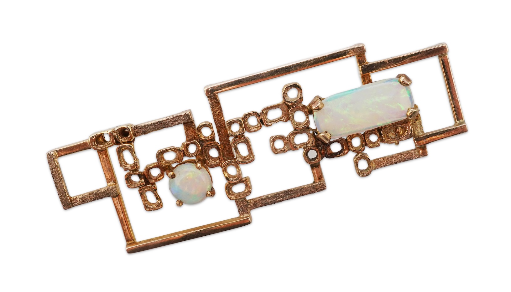 An opal brooch, 1970s, set with two cabochon opals, in an abstract geometric frame, mounted in gold, length 5 grams, stamped 9ct, gross weight approximately 5 grams