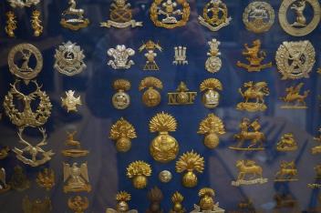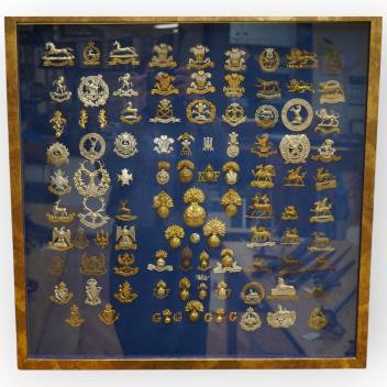 Lot 58 , A framed and glazed display of military cap badges and Glengarry badges, including; The King’s Own Hussars, the Royal Army Veterinary Corps, the Welsh Regiment, the York & Lancaster regiment, the Bedfordshire regiment, t