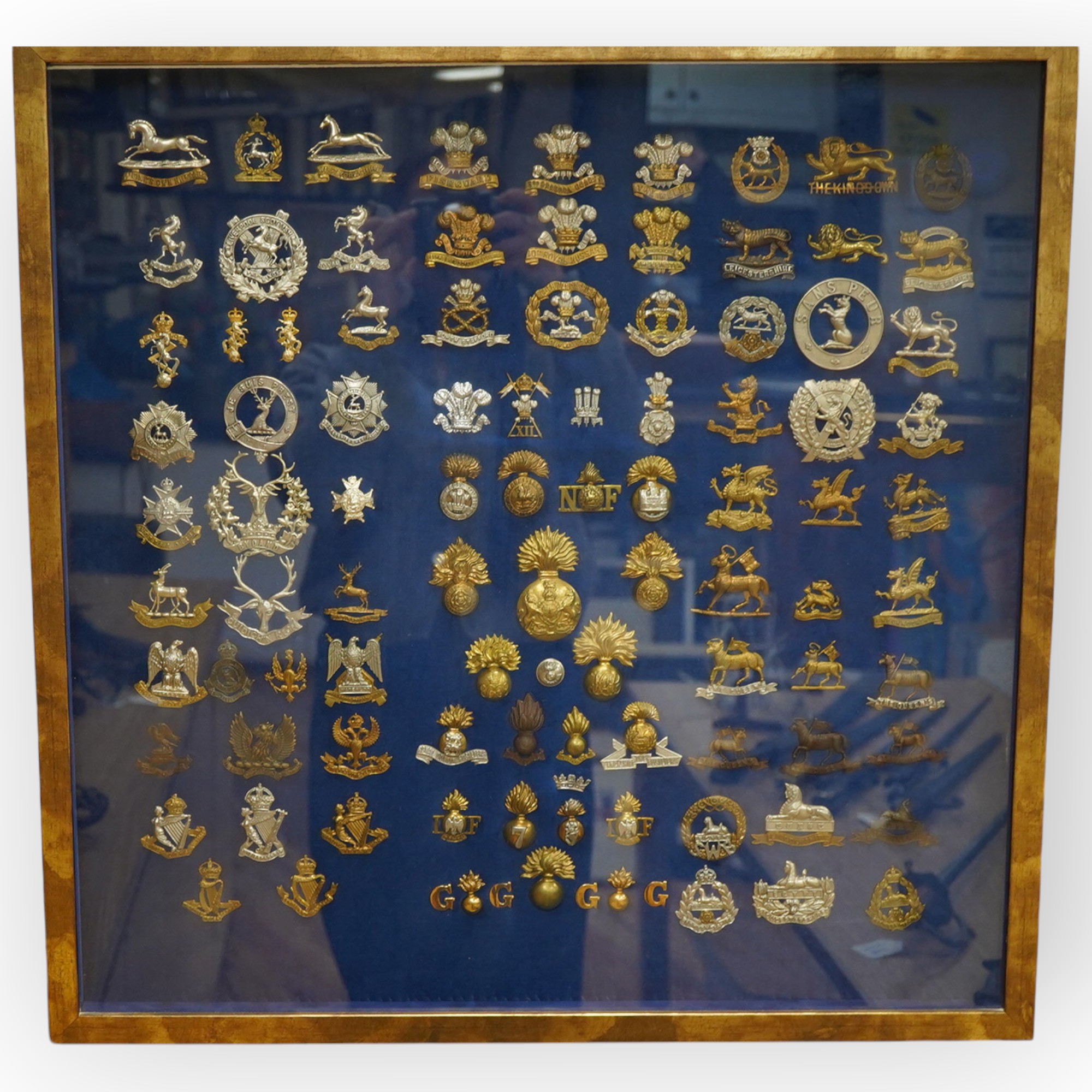 A framed and glazed display of military cap badges and Glengarry badges, including; The King’s Own Hussars, the Royal Army Veterinary Corps, the Welsh Regiment, the York & Lancaster regiment, the Bedfordshire regiment, the Sherwood Foresters, the Gordon Highlanders, the Northumberland Fusiliers, the London regiment, the Lanarkshire Yeomanry, the Queen‘s West Surrey regiment, etc., the frame 63.5 x 63.5cm