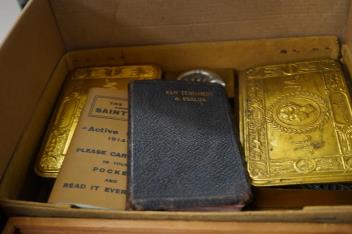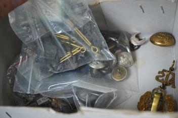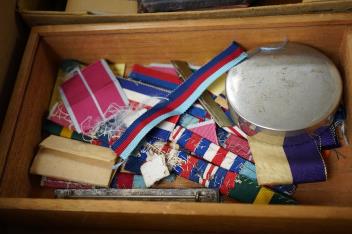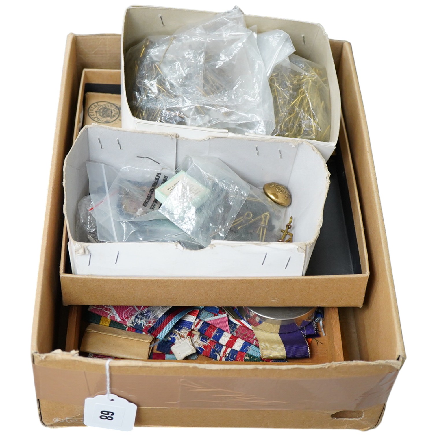 A collection of militaria and medals, including; a First World War medal pair awarded to 3511. 1.A.M. A. Shaw. R.A.F., a Victory medal awarded to DM2-151641 Pte. B. Greenwood. A.S.C., together with four WWII medals including the Africa star, and ten WWII miniature medals, plus a number of spare medal ribbons, two Princess Mary Christmas 1914 tins, a cased silver medal, a cased silver ATS lapel badge, a large quantity of cap badge pins and a few backing plates, and a small quantity of cap badges, and other items