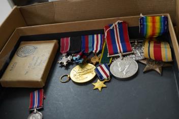 Lot 68 , A collection of militaria and medals, including; a First World War medal pair awarded to 3511. 1.A.M. A. Shaw. R.A.F., a Victory medal awarded to DM2-151641 Pte. B. Greenwood. A.S.C., together with four WWII medals inclu