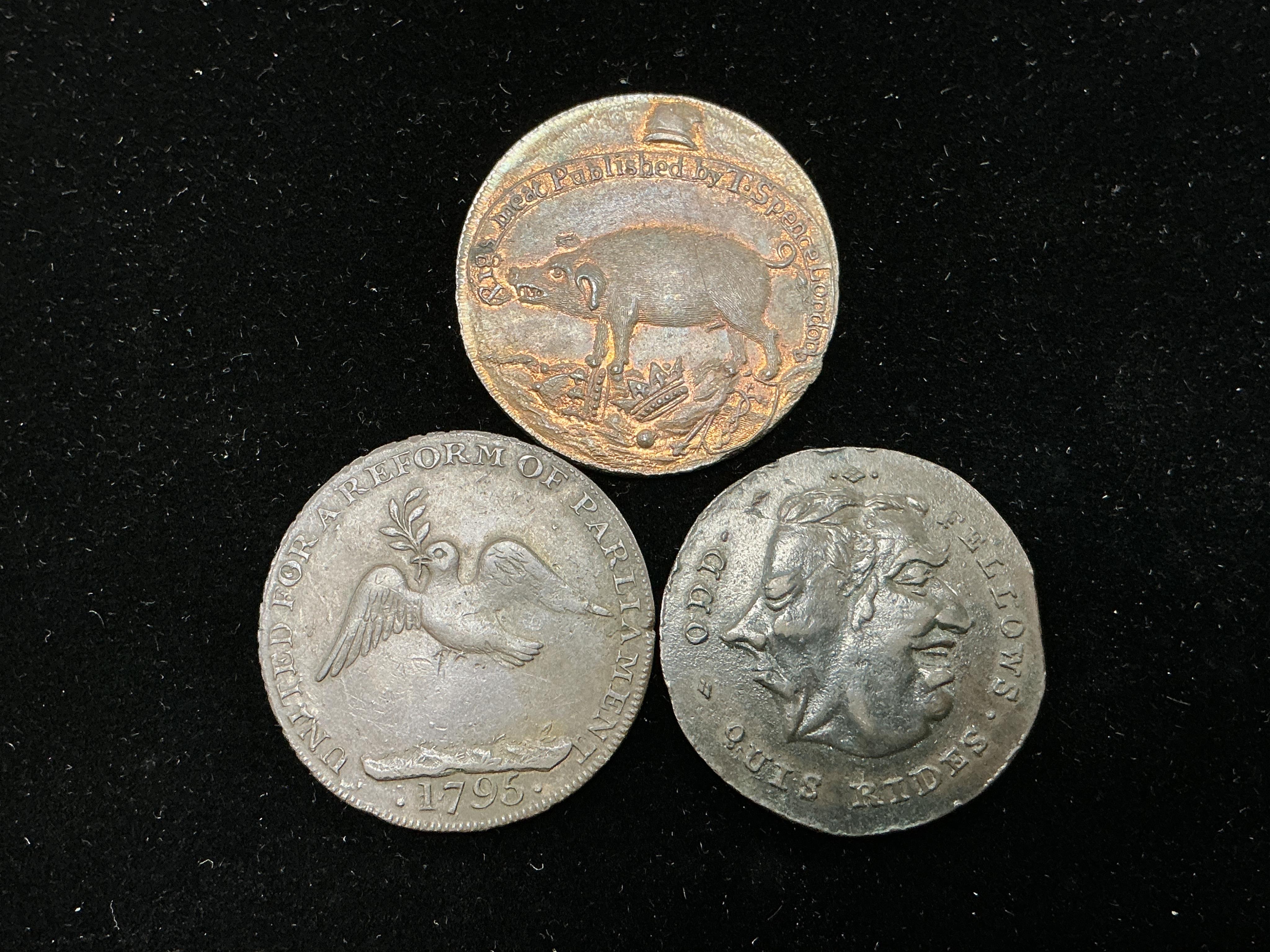 Lot 2147 , Thomas Spence, 1750-1814, three Middlesex Copper Halfpenny Tokens, 1790s, comprising, Pigs Meat published by T. Spence London, Rev. hand below Honour, EF, some lustre, United for a Reform of Parliament, 1795, rev. May Sl