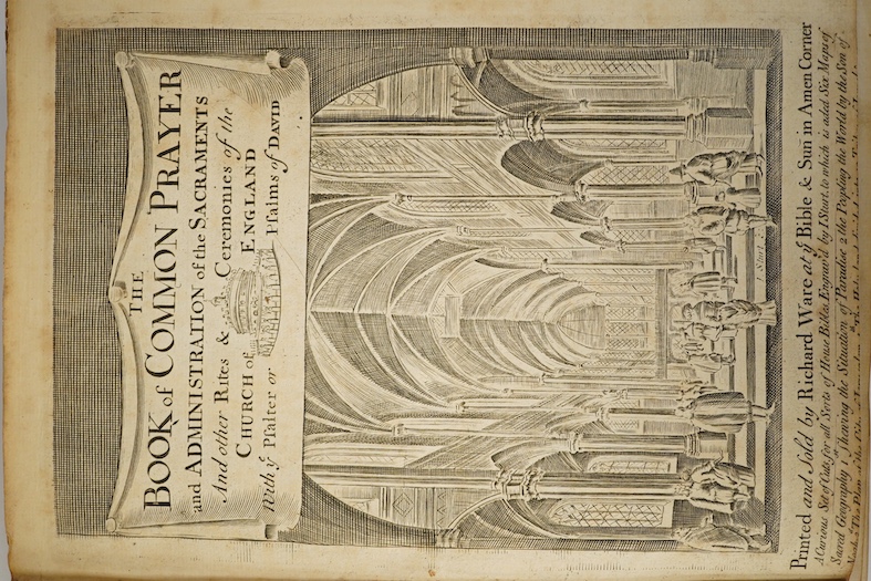 binding wear, spine damaged and upper board loose, bndg partially broken, f.f.e.p and BCP title and contents, Ware's pictorial engraved title, 2nd title (giving J.Cole as engraver) and Bakett's general title are loose, usual non obliterating stains, spots etc; Ware's plts plced throughout- as relevant, Ware 1st title with marginal clean tear and pasted on blank verso of Baskett's BCP. final leaf. BCP. signatures A-F8, G4, H2; Bible - A-Z8, Aa-Tt8, Uu4, A-K8, A-N8, 04. Herbert calls for the index, tables and Downame's Concordance (printed for R. Ware... 1745). Ownership at front of Nathaniel Clements (Dovercourt , 1803). The Ware plates have 4 images to each.