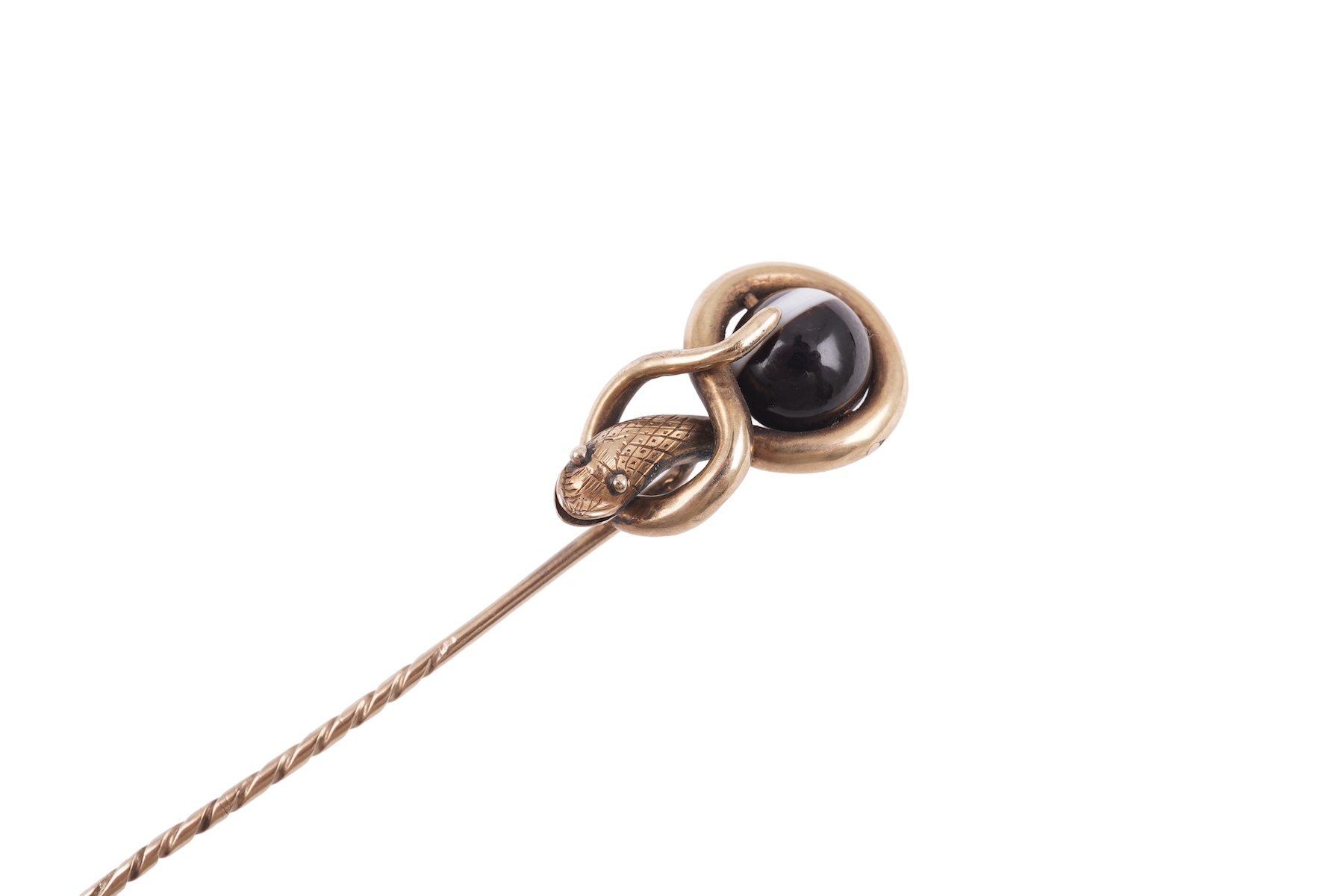 A Victorian onyx stick pin, mid 19th century, designed as a snake coiled around a cabochon of banded onyx, mounted in gold, length 9.3cm, gross weight approximately 4.5 grams