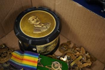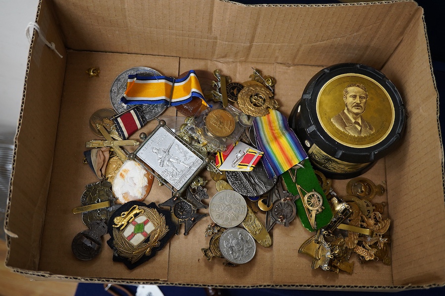 A collection of cap badges, medals etc., including; a First World War medal pair awarded to 93745 A-Cpl. H. Elderfield. R.A., together with a George VI Coronation medal and a London County Council medal, together with a number of cat badges and other decorations, a 1797 cartwheel Penny, a Lusitania commemorative medal, a General Gordon commemorative thread box, and a number of other items