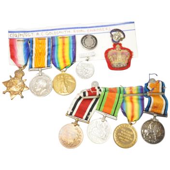Lot 95 , Two First World War medal groups;, a trio awarded to 45031 2.Cpl. A.C. Goldsmith. R.E., together with four other items, a First World War pair together with a Defence medal and a Special Constabulary medal, awarded to 10