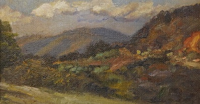 Attributed to Constance Manning, ‘Landscape’, unsigned, details verso to include provenance: ‘Lawsons Sydney Auction 11th April 2000, from the estate of Tempe Manning’, oil on board, 11.5 x 21.5cm