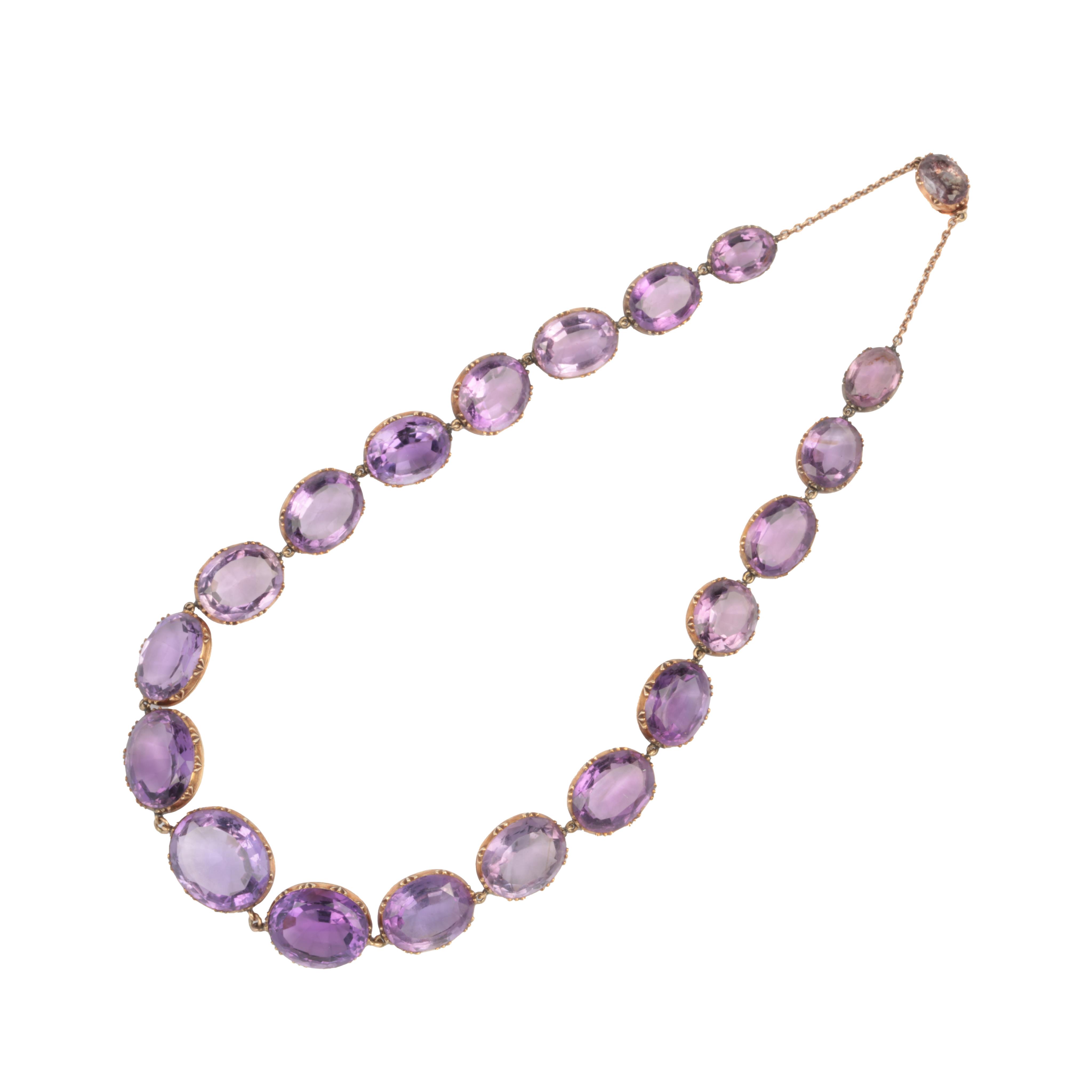 A Victorian amethyst rivière necklace, mid 19th century, composed of graduated oval amethysts in gold collet settings, the largest measuring approximately 20 x 16 x 8.3mm, to a foil-backed amethyst clasp, length 45cm, later chain extension, gross weight approximately 55 grams, one amethyst loose